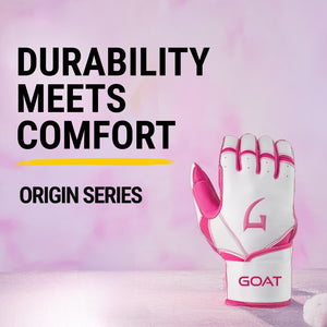 The Origin Series Long Cuff White and Pink Batting Gloves bring color and performance together. They’re built to feel good from day one, give you reliable grip, and add extra wrist support so you can swing with confidence every at-bat.