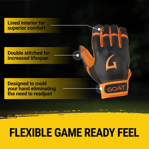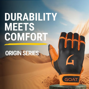 Why GOAT? GOAThletic Batting Gloves are crafted using premium GOATskin leather, which provides unmatched durability, comfort, & performance. Our Origin Series Short Cuff Black and Orange Batting Gloves are reinforced with heavy double stitching ensuring a superior fit & feel while significantly increasing longevity. They offer a soft, luxurious feel that enhances your grip while molding to your hand over time, improving with every use.