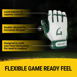 Take your game up a notch with GOAthletic’s Origin Series Short Cuff White and Green Batting Gloves. Perfectly suited for baseball and softball players seeking sharp style and consistent comfort on every swing.